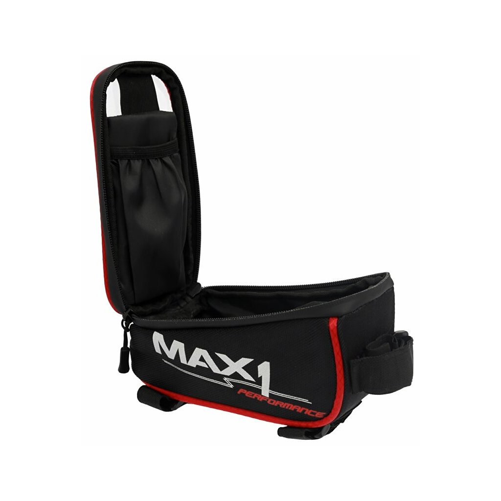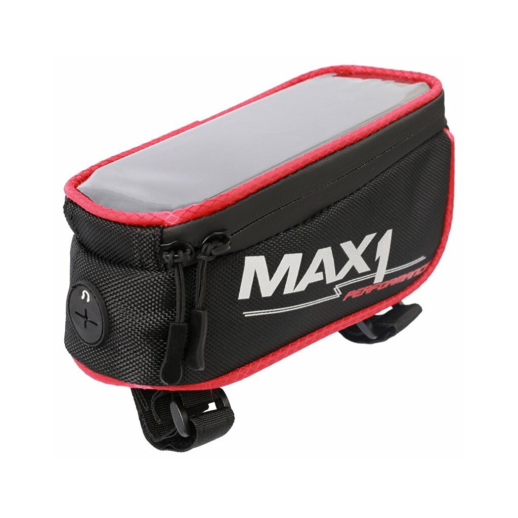 Kompaktní brašna MAX1 na rámovou trubku s kapsou uzpůsobenou pro mobilní telefon.Gumová membrána pro umístění sluchátek ve spodní části brašny. Pasuje na většinu standardních rámů.