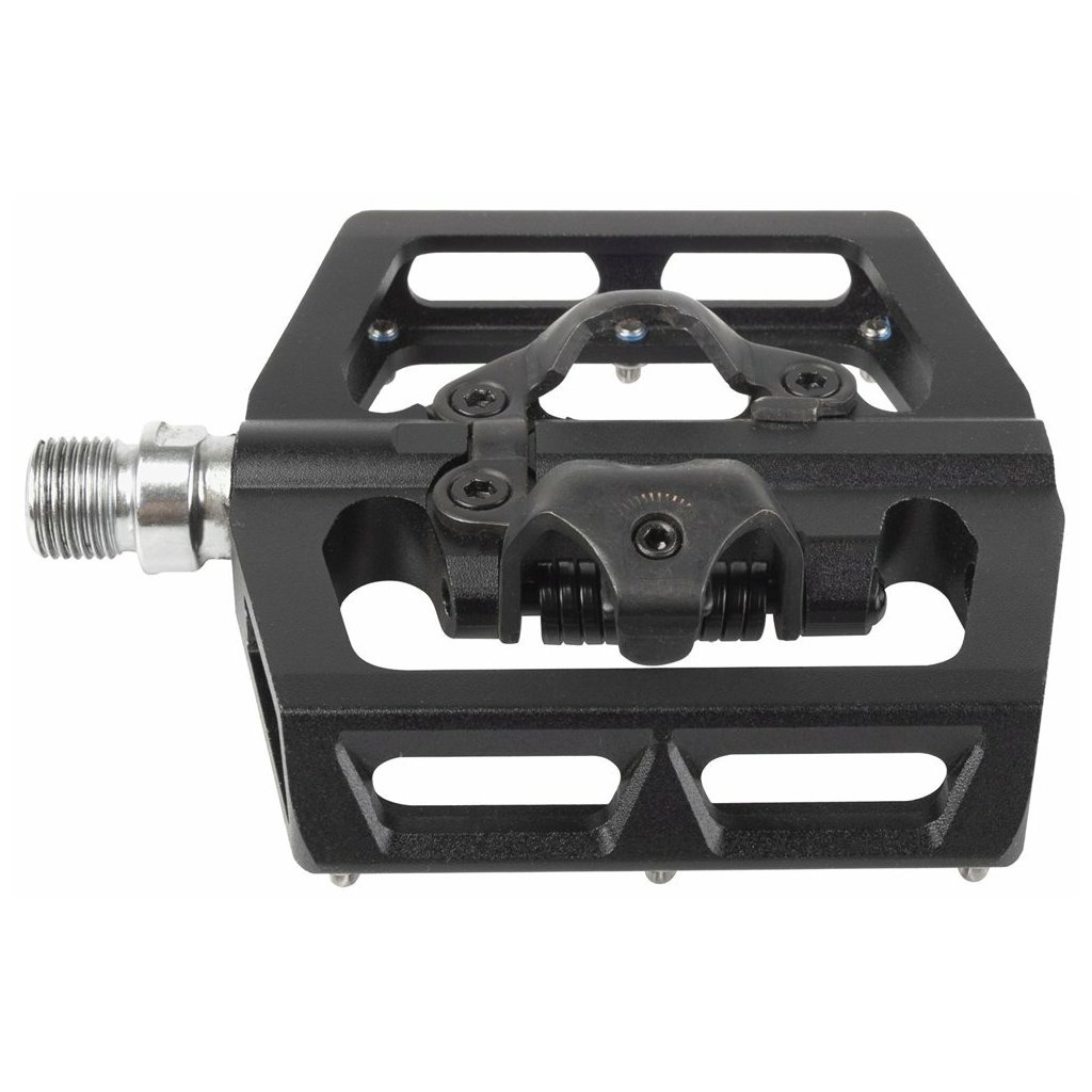 Platformové pedály M-Wave kombinovéné s nacvakávacím pedálem s možností použití kufrů SPD.- osa CrMo