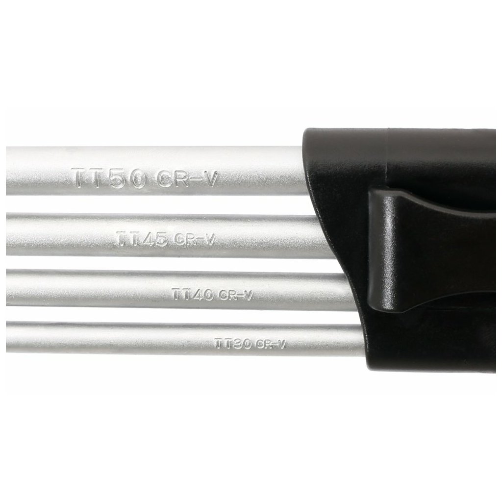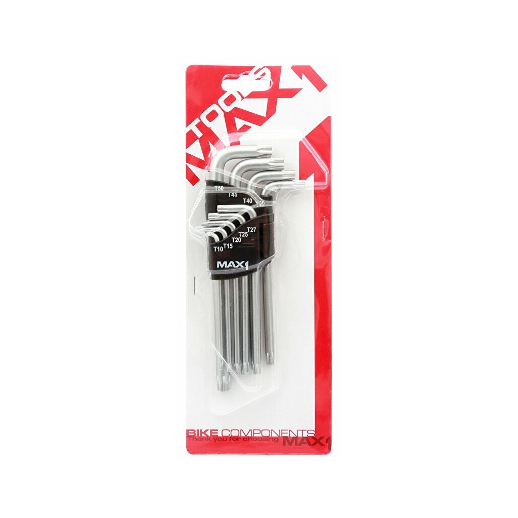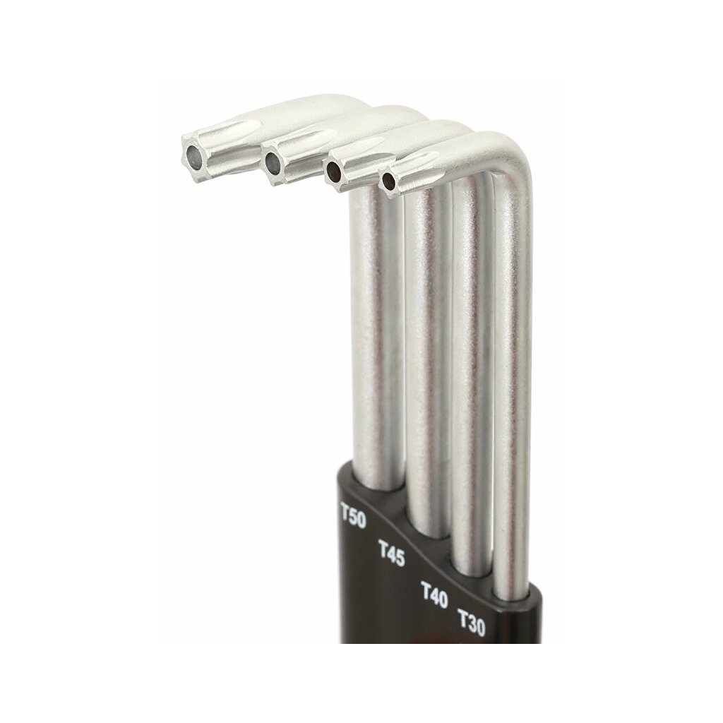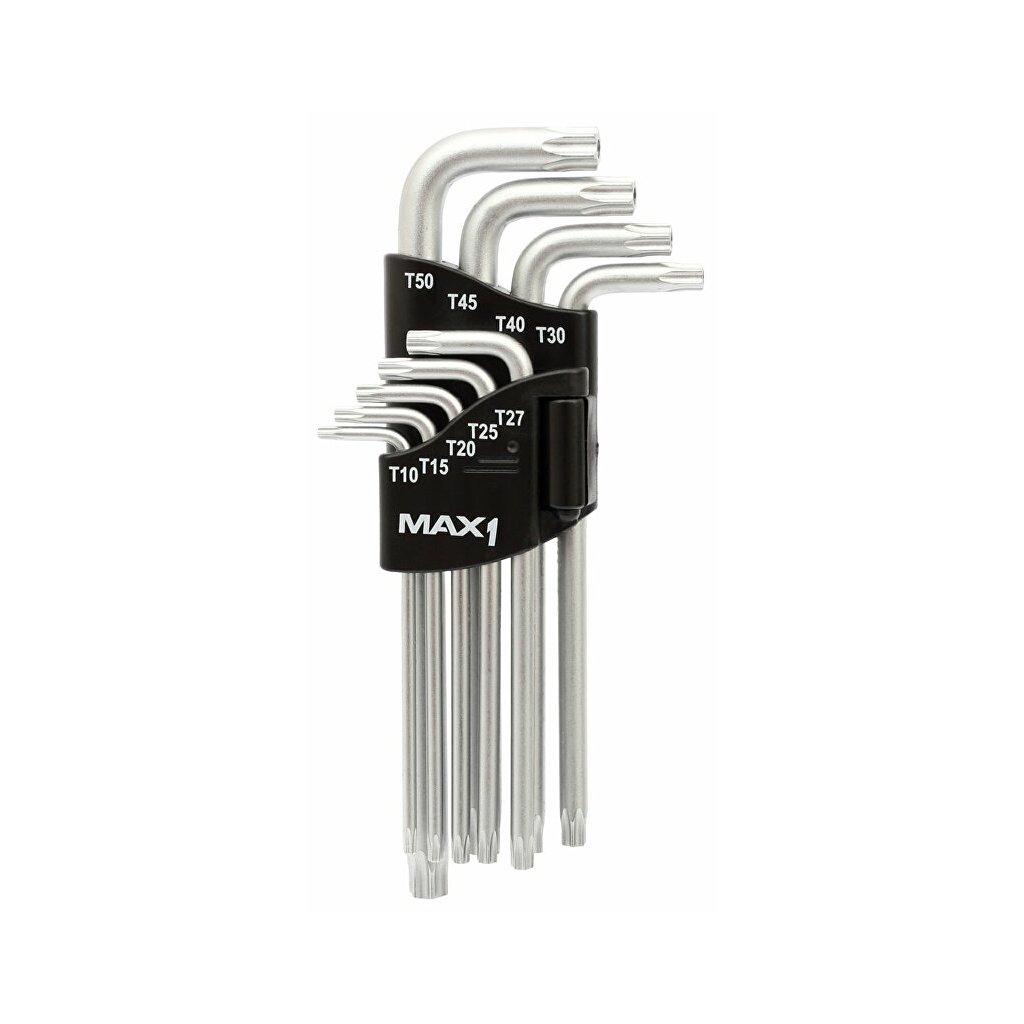 Sada torxových klíčů MAX1. Díky vrtanému otvoru uprostřed lze použít i na torxové šroubky s výstupkem. Kvalitní kalený materiál CR-V.- CR-V materiál