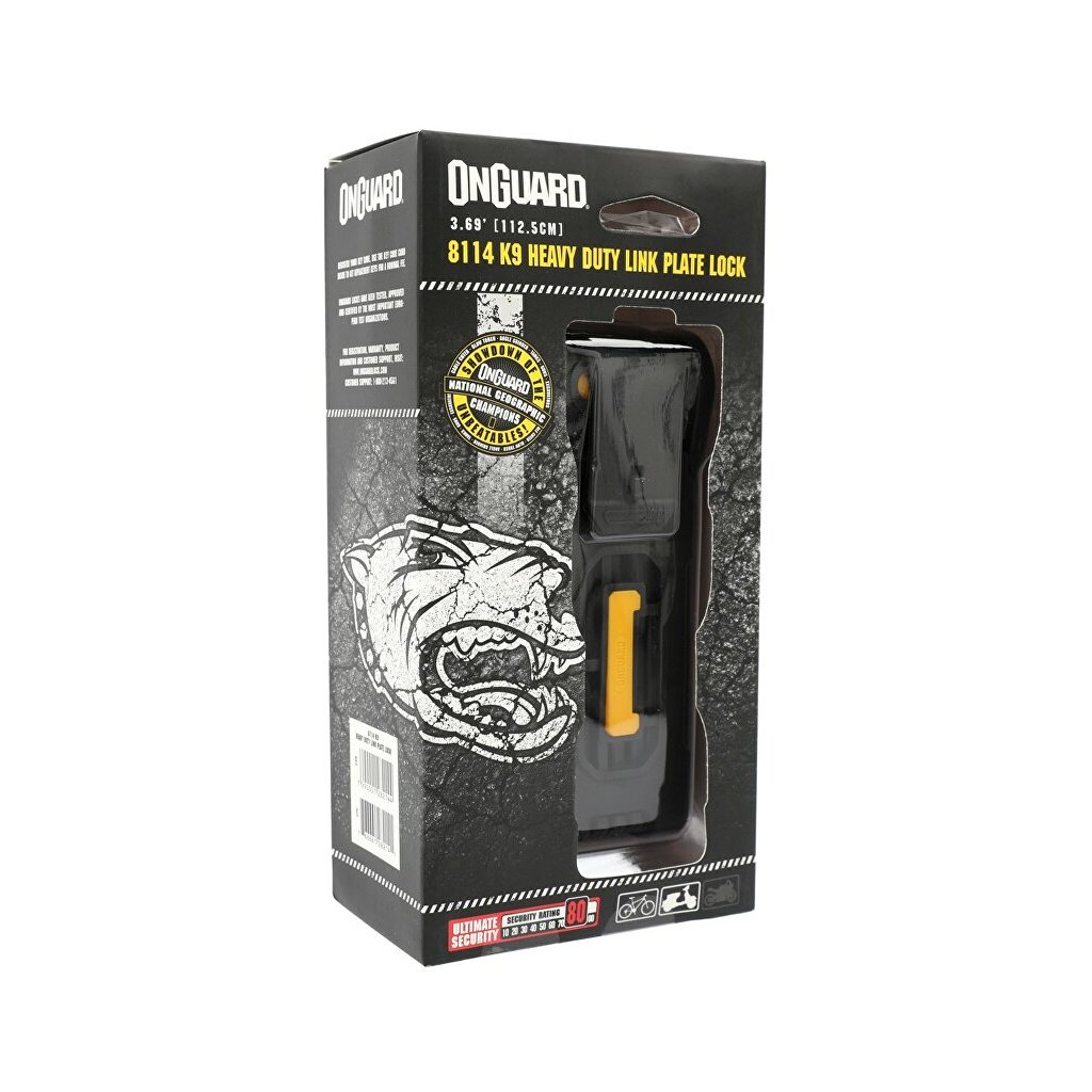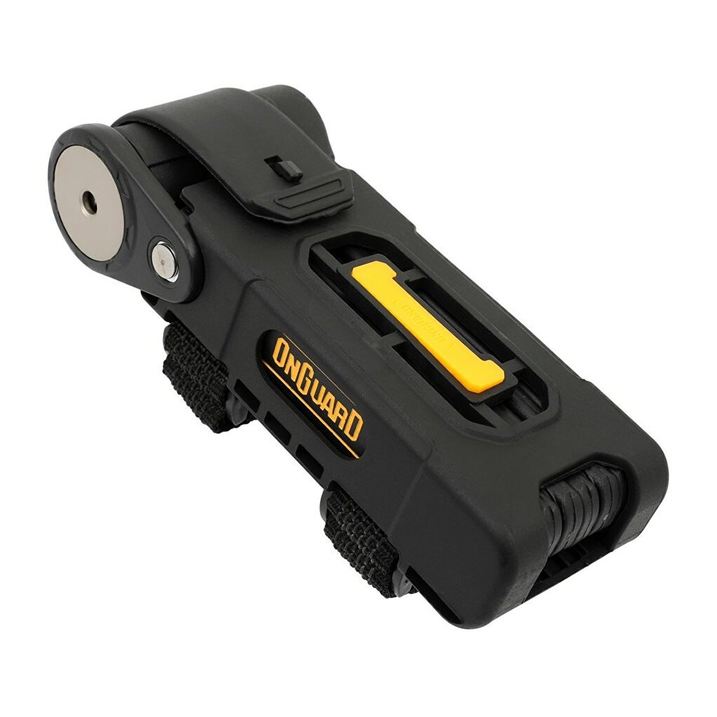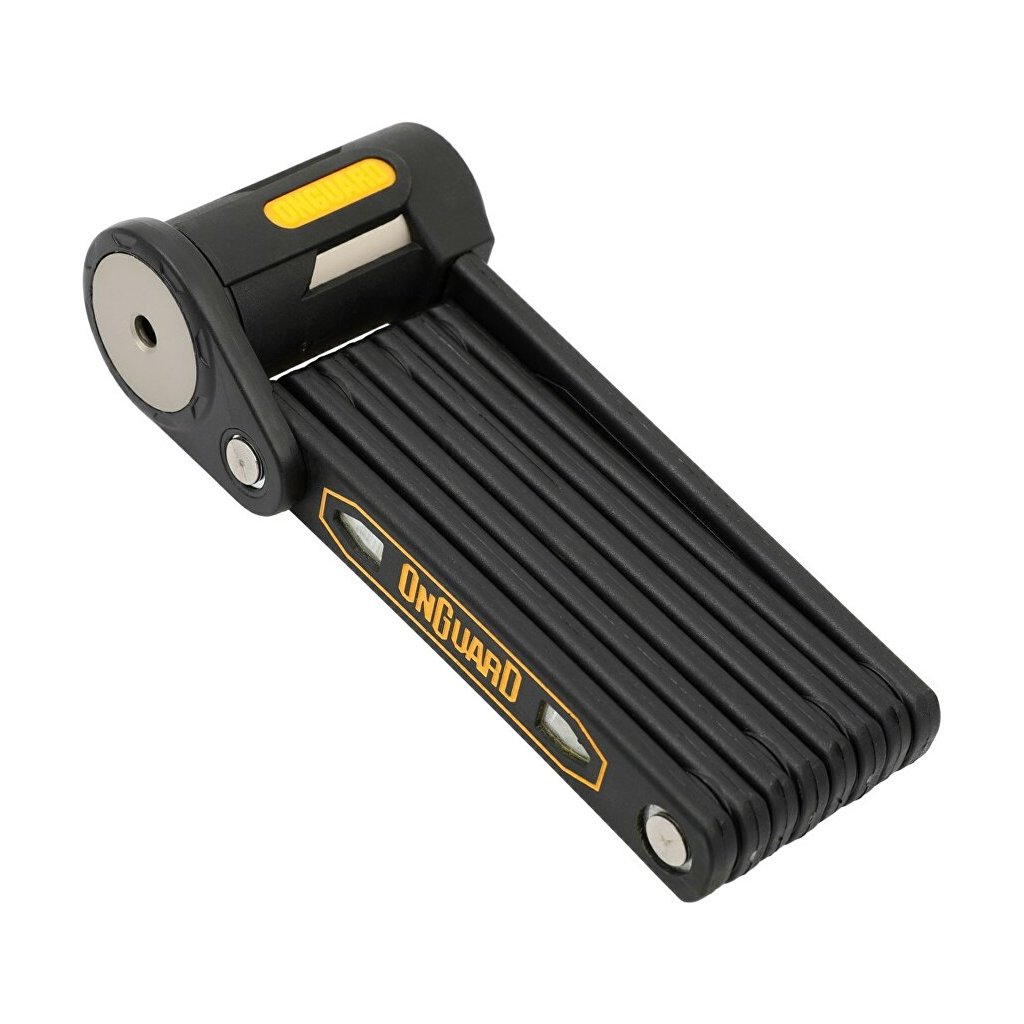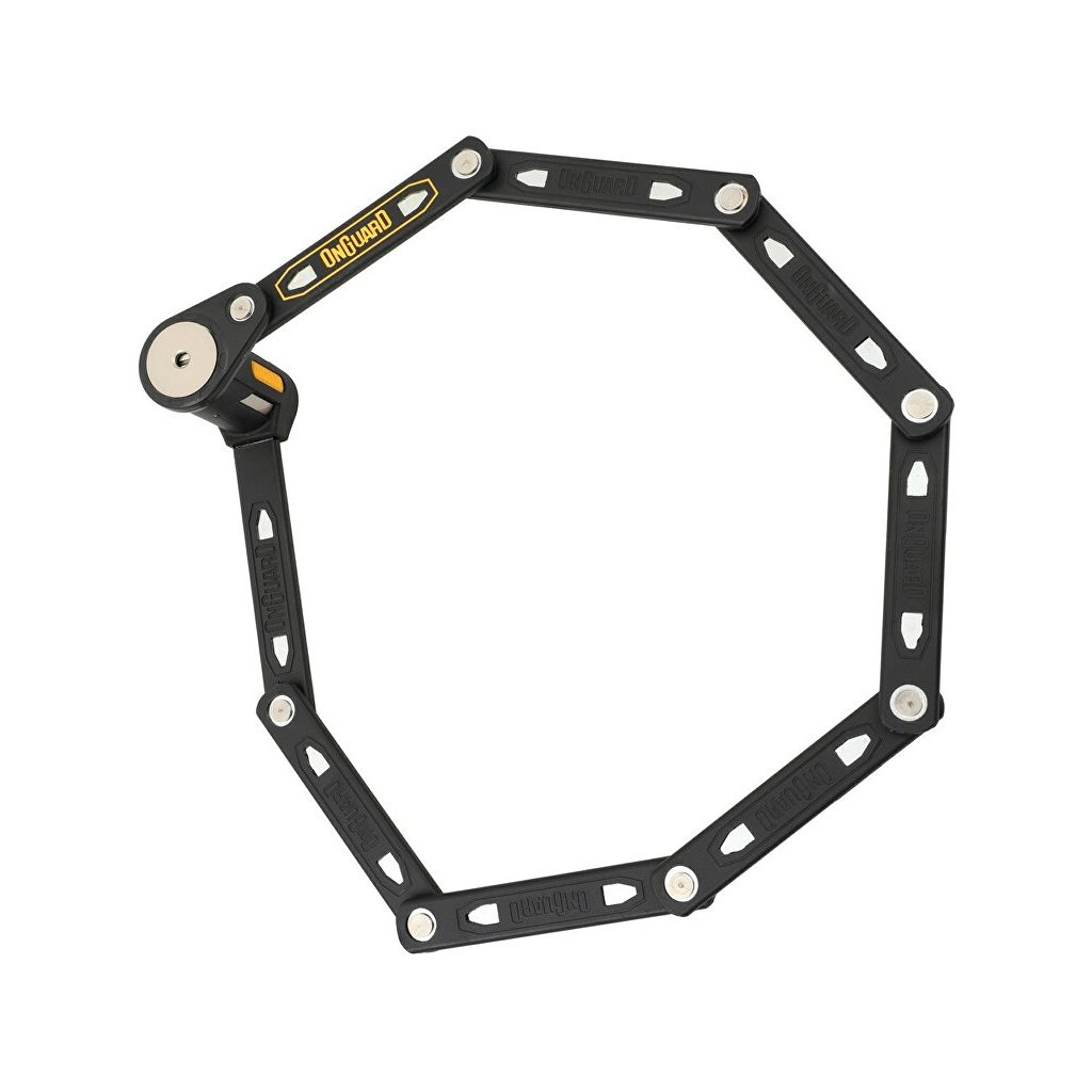 Efektivní, jednoduchý a vysoce účinný skládací zámek ONGUARD. Zámek je lehký, snadno použitelný a nabízí zabezpečení blížící úrovni U-zámků, ale s jednodušší manipulací, při menších rozměrech. Kalené články s dvojitým potahem plastu a žluté gumy dokonale chrání před odřením. Vhodný pro jízdní kola, motocykly, brány a další.Specifikace: