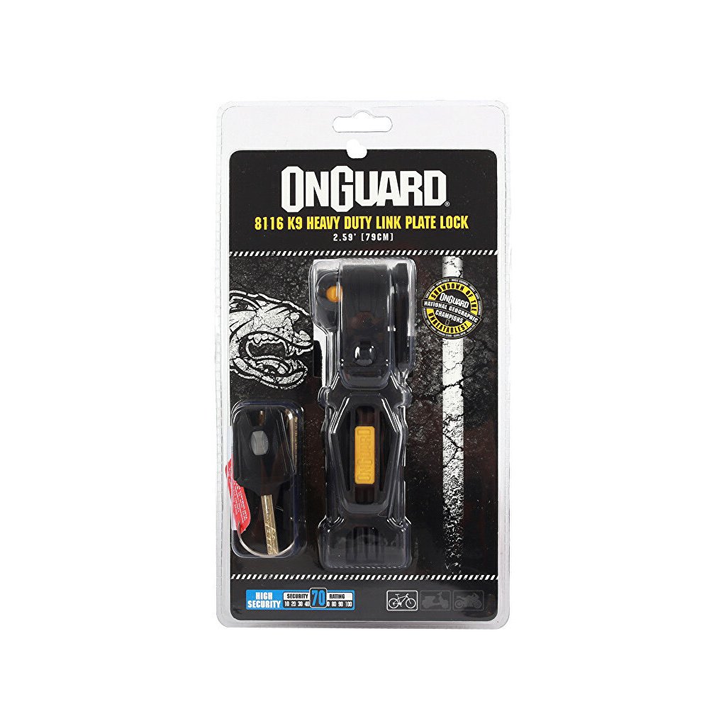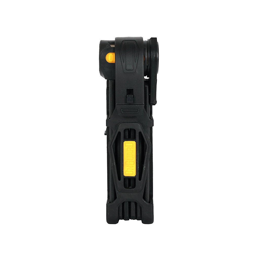 Efektivní, jednoduchý a vysoce účinný skládací zámek ONGUARD. Zámek je lehký, snadno použitelný a nabízí zabezpečení blížící úrovni U-zámků, ale s jednodušší manipulací, při menších rozměrech. Kalené články s dvojitým potahem plastu a žluté gumy dokonale chrání před odřením. Vhodný pro jízdní kola, motocykly, brány a další.Specifikace: